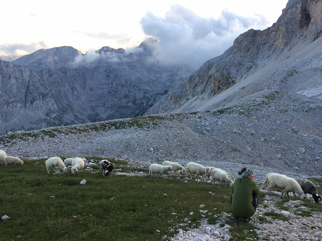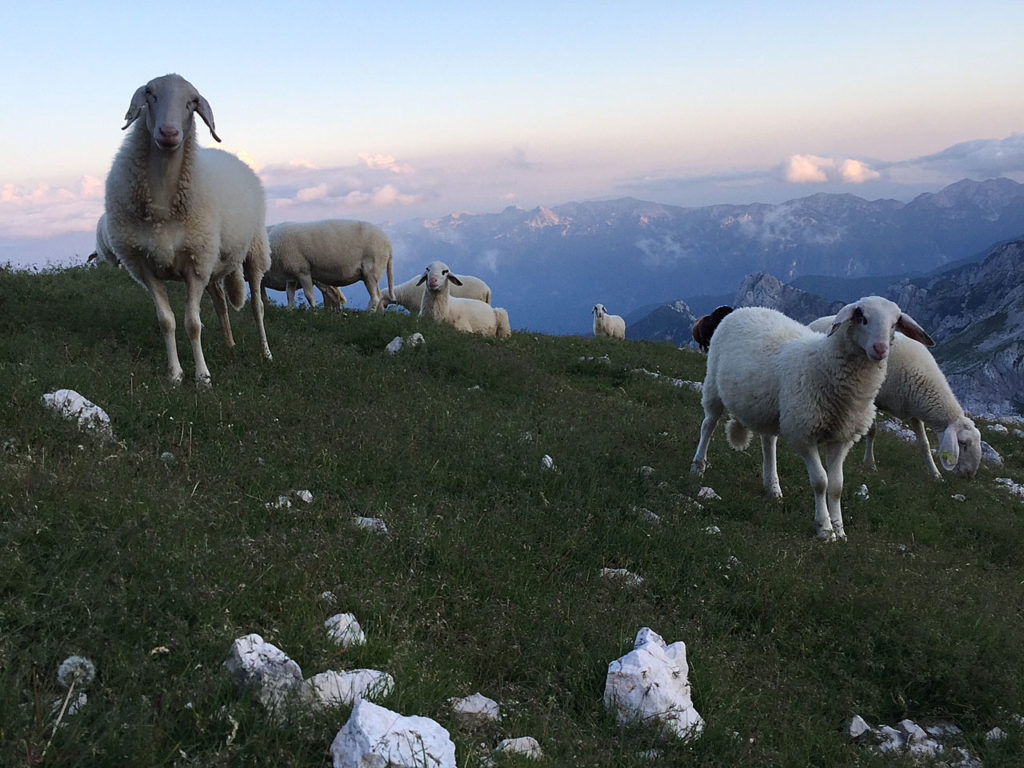 Doch Gemütlichkeit geht ja zuallererst von den Menschen aus, und so verbringen wir einen netten Abend mit internationalem Publikum. Die Bergpanorama-Abendstimmung krönt eine Schafherde, die sich im Sonnenuntergang rund um das Plumpsklo-Häuschen schart und fröhlich blökt. Doch da wir jetzt ja echte Sloweninnen sind, brauchen wir keinen Dolmetscher. (Aber wie war das jetzt eigentlich: Sind wir jetzt nun echte Sloweninnen oder doch nicht?!)