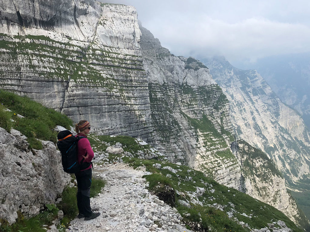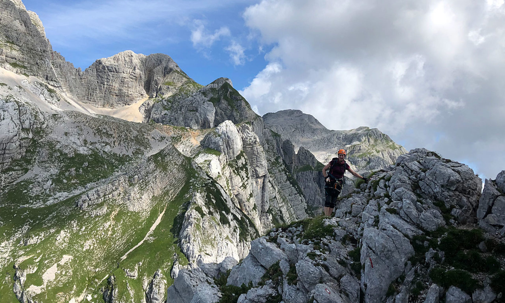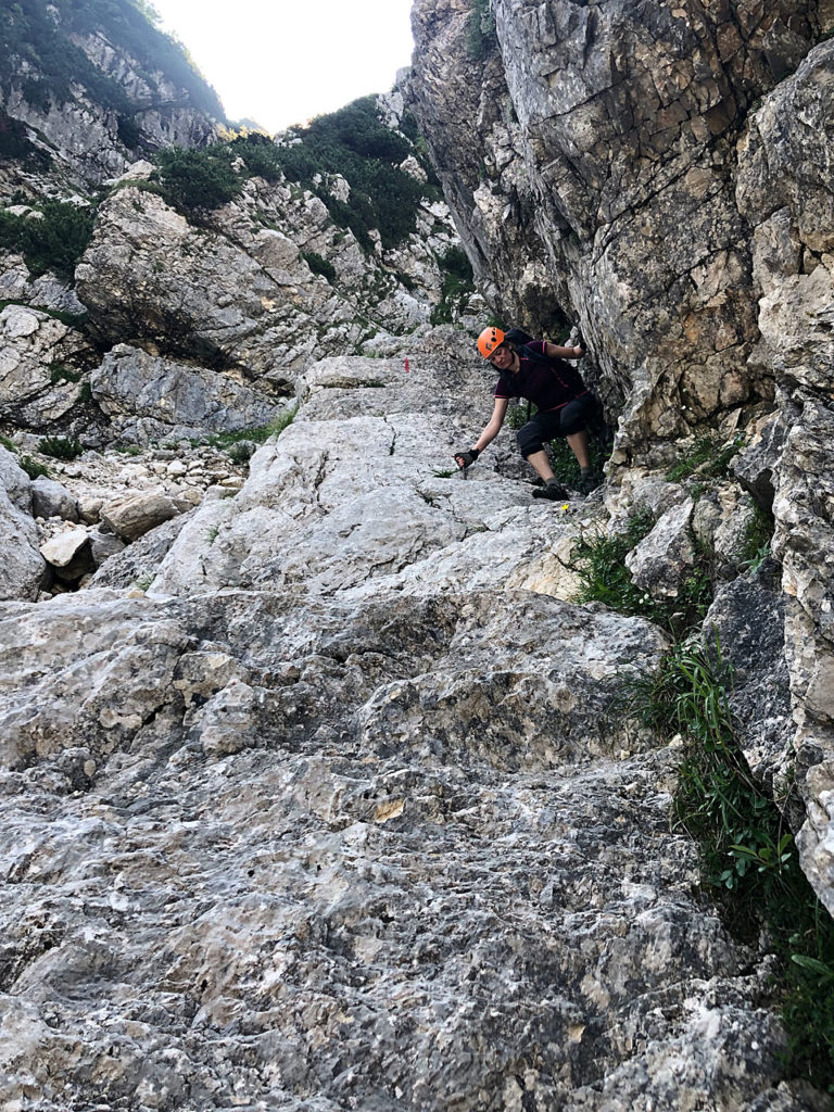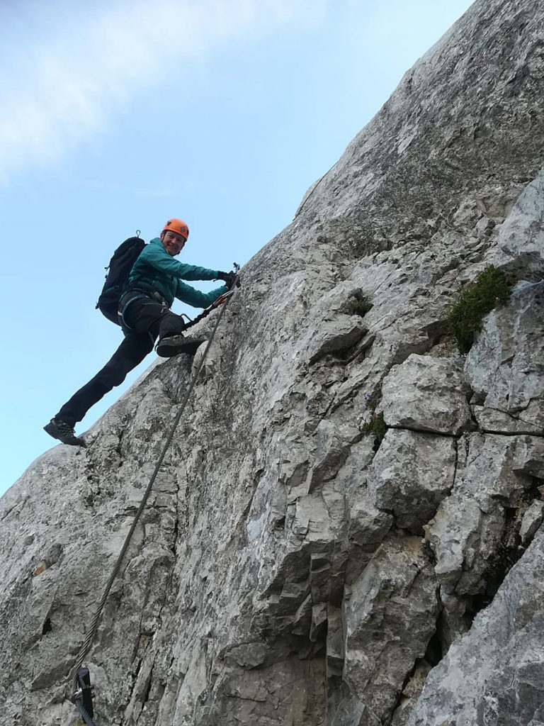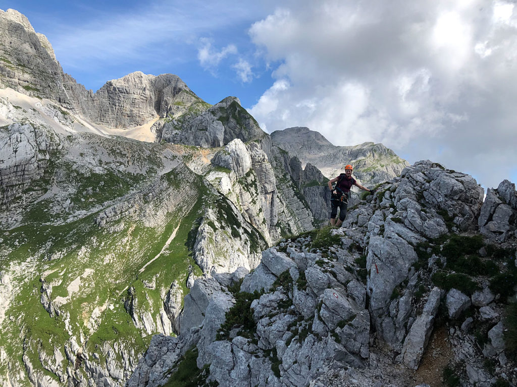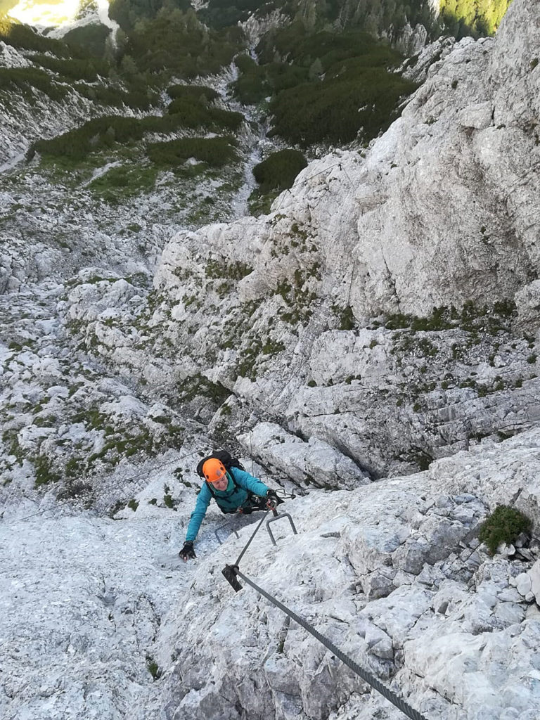 Eine Traumlandschaft, die an vielen Stellen imposante Ausblicke auf die Steilwand erlaubt. Luftig und ausgesetzt führt der Weg über mehrere – in slowenischem Stil – versicherte Stellen, bis hin zum Einstieg zum ÖTK-Klettersteig (B), über den wir absteigen.