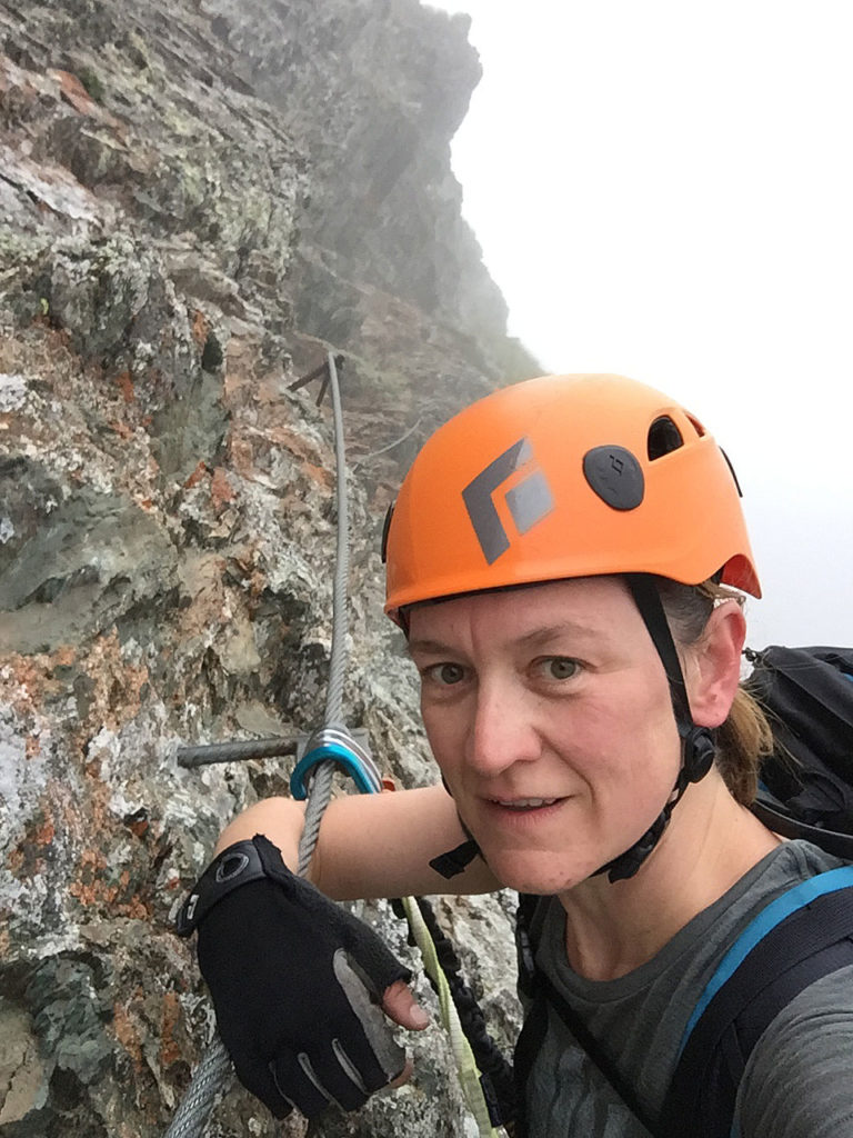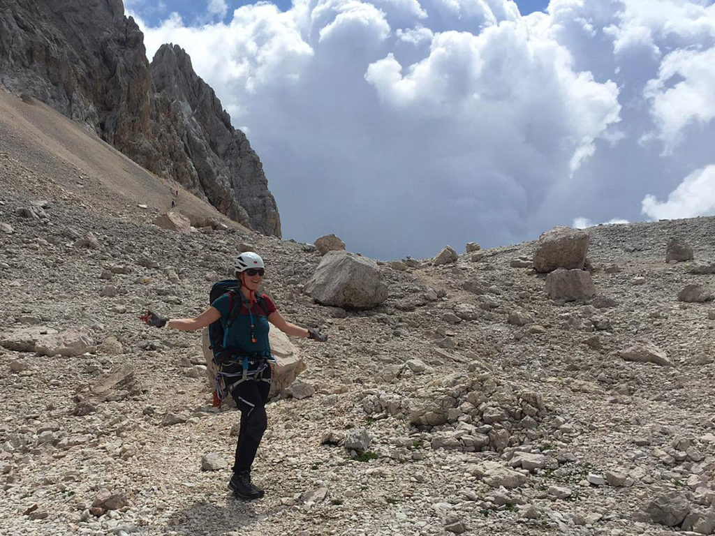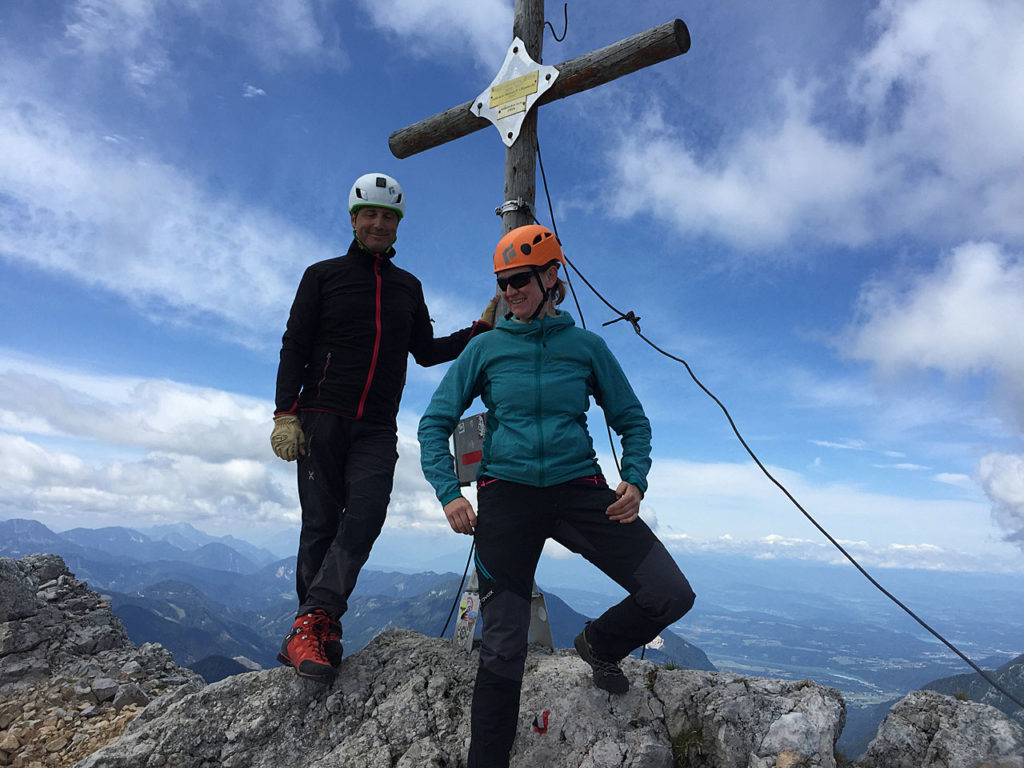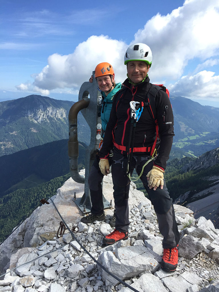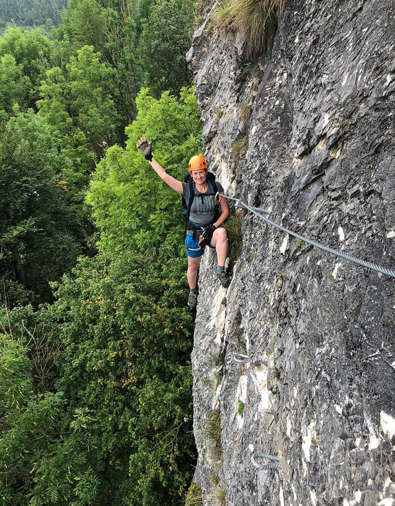 Und noch ein Wort zum Schluss: Klettersteige sind, wenn sie schwieriger werden, ein Kraftakt. Klar ist es auch für mich spannend, das mal auszuprobieren, wie weit ich gehen kann und ob ich das schaffe. Aber mit Klettern haben sie, je schwieriger sie werden, wenig bis gar nichts zu tun. Letztlich hangelt man sich ja doch nur am Stahlseil entlang und nicht die Technik, sondern einzig die Armkraft entscheidet darüber, ob man einen extrem schweren Klettersteig schafft oder nicht. Warum es einen deutlichen Trend gibt, immer noch schwierigere Klettersteige einzubohren, wird mir ein Rätsel bleiben. Aber im Herzen bin ich halt doch mehr Kletterin als Klettersteiggeherin…