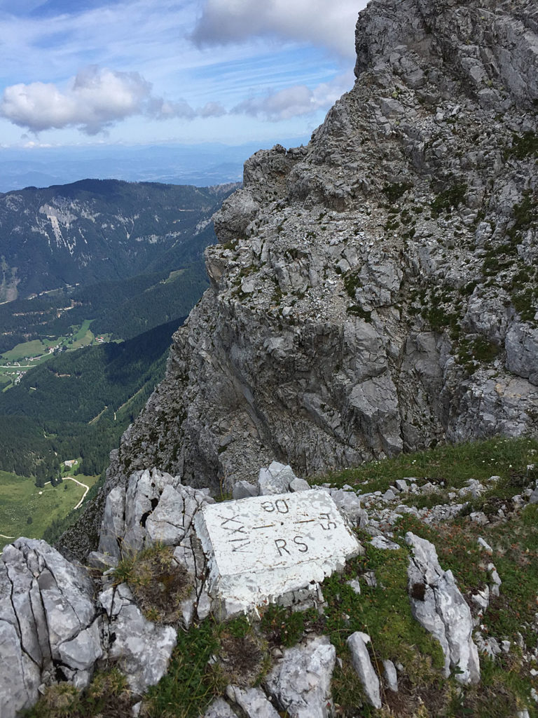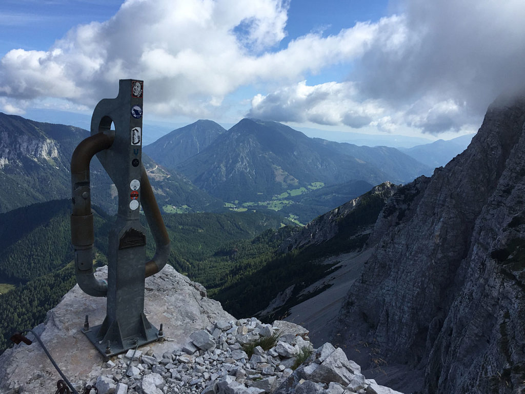 Klettersteig auf Slowenisch bedeutet nicht, dass man mit durchgehenden Stahlseilen rechnen darf, wie wir am Bamberg-Weg bereits festgestellt haben. Auch auf dem Gipfelaufbau gibt es kein durchgehendes Seil. Zahlreiche Metallstifte, die aber nicht als Tritte, sondern als Griffe dienen, erleichtern den Aufstieg auf den abgenudelten Fels. Ebenso die unzähligen Stufen, die in den Fels geschlagen sind. Diesen Berg will schließlich jeder schaffen.
