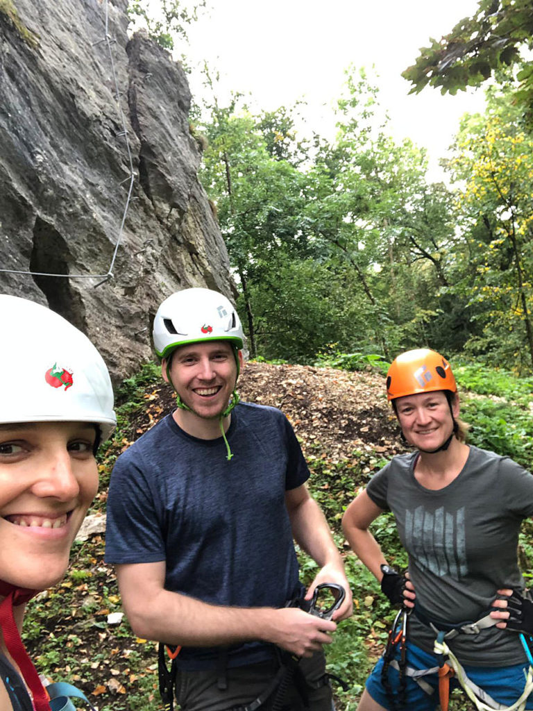 Doch wir lassen uns nicht abschrecken. Kondition und Verfassung passen. 120 Höhenmeter klingen zwar wenig, doch die Wand wird recht geschickt ausgenützt: zuerst klettert man über die ganze Breite nach rechts, dann zurück nach links. Klingt monoton? Ist es nicht. Insgesamt ergeben sich dadurch 450 Klettermeter.