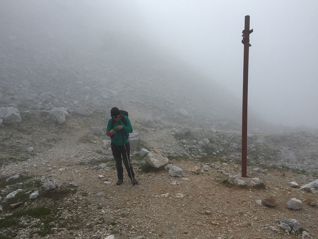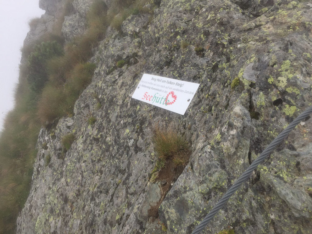 Doch irgendwie hat das Wetter die Prognose dann nicht ganz so wörtlich genommen. Aus der vorhergesagten Wetterbesserung – es war bedeckt und tröpfelte am Einstieg – wurde zum Gipfel hin immer dichterer Nebel. Von Auflockerungen keine Spur. Aber naja. Am Klettersteig kann man sich nicht verlaufen, die Einsamkeit am Steig besiegte das Karabiner-Scharren, das vom Murmeltier-Klettersteig herüberwetzte. Und der Abstieg könnte leichter nicht sein. Also nix wie rauf.