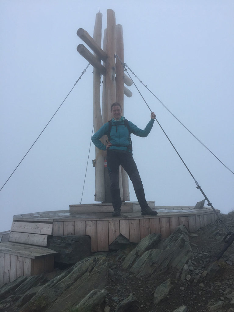 Um 12.45 stehen wir am Gipfel und grinsen über beide Ohren. Die Anstrengung hat sich gelohnt. Was für ein Massiv! Und was für ein Erlebnis, am Wiesbachhorn zu stehen! Mein bisher höchster Gipfel gibt sich mystisch, der Blick ins Tal und Richtung Süden ist in Wolkenfetzen gehüllt.
