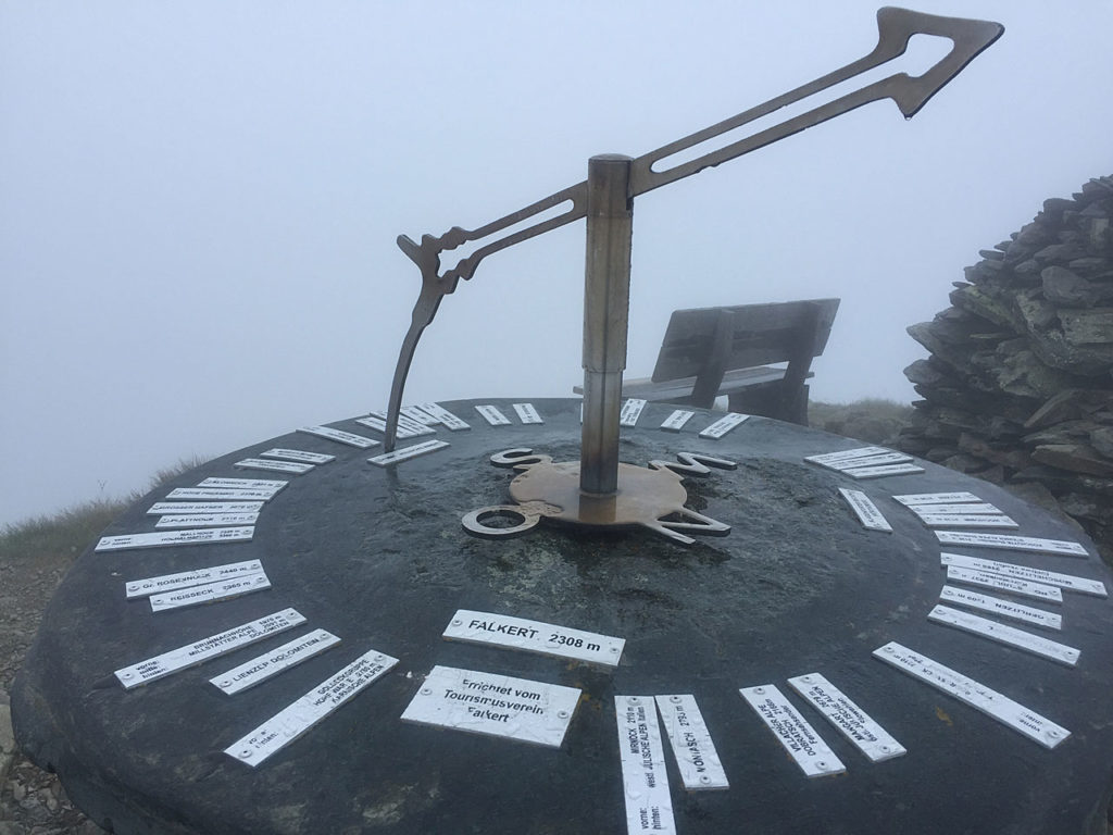 Den Weg zum Gipfel des Falkert (2308m) spare ich mir nicht. Gipfel ist schließlich Gipfel. Oben weist eine schöne Plakette darauf hin, welche weiteren Gipfel man von hier aus sehen könnte.