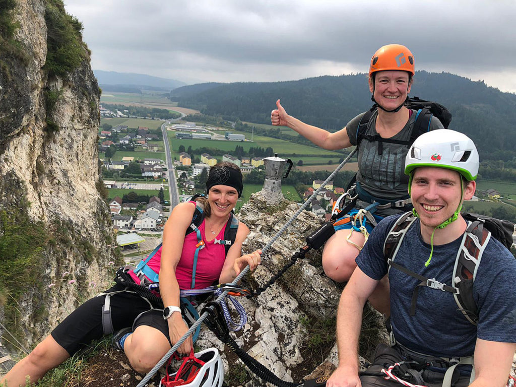 Schwer motiviert, mich an diese Aufgabe zu wagen, mache ich mich mit Tina und Daniel im Gepäck an einem Samstag im August auf den Weg nach Griffen. Der „schwerste Klettersteig Kärntens und der schwerste E-Klettersteig der Ostalpen“ – solche Attribute erfüllen ihren Zweck zu Recht: abschreckend zu wirken.