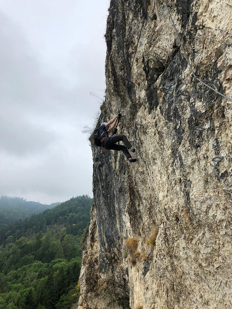 Doch diesmal stimmt alles: Die Temperaturen sind angenehm an diesem Samstag, wenn auch etwas schwül, es ist bedeckt, wir sind ausgeruht und vor allem früh genug dran. Der Zustieg dauert nur wenige Minuten. Die ersten Meter starten dafür gleich knackig mit C/D und D. Den Notausstieg, der nach den ersten Metern direkt nach oben zum Ausstieg führt, brauchen wir nicht. Ab da wird der Steig aber zunehmend schwerer. Selbst wenn man sich von Zeit zu Zeit in der Rastschlinge ausruht, sind die Oberarme und vor allem die Haut an den Händen stark gefordert.