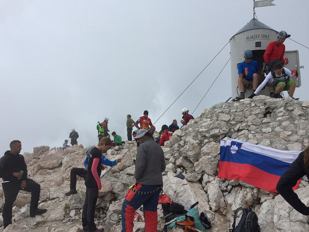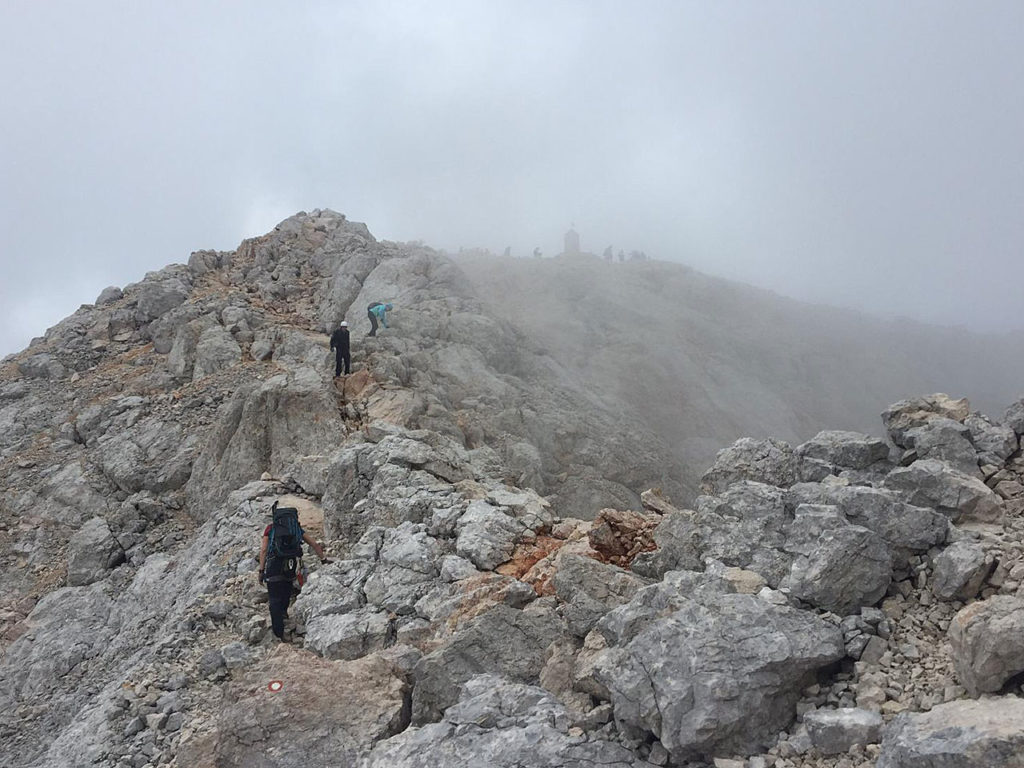 Am versicherten Einstieg kommt uns eine ganze Kolonne Menschen entgegen. Ein bisschen zittern wir ja immer noch wegen dem Wetter. Und dann: Stau am Gipfelaufschwung! Wie bei vielen begehrten Gipfeln zieht auch der Triglav wie ein Magnet Menschen an, die der Schwierigkeit eigentlich gar nicht gewachsen sind. Die leichenblassen Gesichter, die uns entgegenkommen, untermauern diese These.