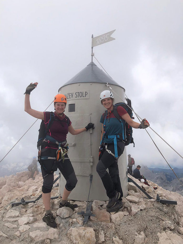 Allein am Gipfel sind wir nicht. Aber das hatten wir auch nicht erwartet. Immerhin ergattern wir einen kurzen Slot, an dem wir die Gipfelrakete Aljazev Stolp nur für uns beide allein beschlagnahmen können. Dass man sich – den Kopf in den Stol gesteckt – an dieser Stelle von einem Triglav-Veteranen den Hintern versohlen lässt und dabei Schnaps trinkt, um die Triglav-Taufe zu erhalten, erfahren wir leider erst im Nachhinein.