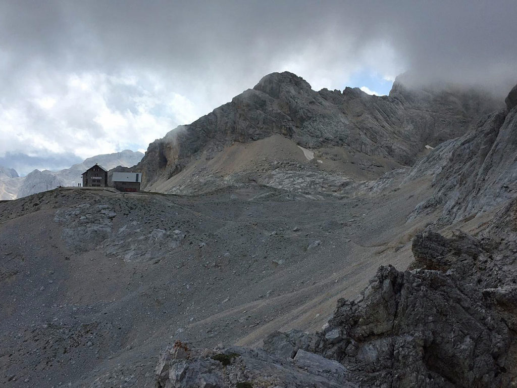 Wenn jetzt nur das Wetter mitspielt… Die Entscheidung, ob wir aufsteigen oder den Gipfelsturm auf den nächsten Tag verlegen, machen uns die dunklen Cumuluswolken, die sich am Horizont türmen, nicht gerade leicht. Wir beobachten und diskutieren. Doch die Türme fallen letztlich allesamt wieder in sich zusammen, bevor sie sich von Neuem aufbauen. Lediglich tiefe Wolken verhängen immer wieder die umliegenden Gipfel und auch den Triglav selbst. Schließlich entscheiden wir uns aufzusteigen.