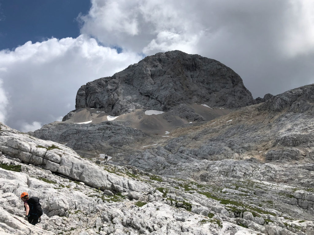 Das heiß ersehnte Traumziel aller Slowenen – angeblich muss ja jeder Slowene ein Mal in seinem Leben auf dem Triglav stehen – haben wir schon bald vor Augen. Nach den ersten Serpentinen, denen wir schließlich über den Bamberg-Weg (Klettersteig B/C) entkommen, der in der Luknja-Scharte startet, stehen wir auf einem Hochplateau, das vom Gletscher und Regenwasser geschliffen und geformt ist. Die bizarre Mondlandschaft ist wunderschön.